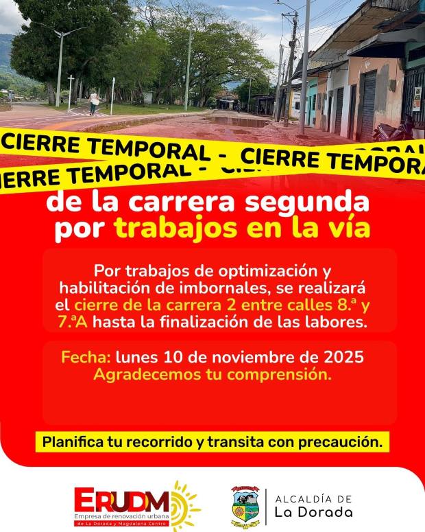 “Estará cerrado el paso vehicular en la carrera 2 entre calles 8ª y 7ªA, mientras avanzan las obras de optimización del alcantarillado”, explicó la Alcaldía de La Dorada.