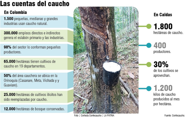 El caucho se conoce como 'oro blanco'. Su materia prima brota en cuatro municipios caldenses: Samaná, Norcasia, Marquetalia y Victoria. Sus ganancias se cosechan allí y en la industria manizaleña. Esa cadena atrajo a Fernando García Rubio, director de Confecaucho, a la capital del departamento.