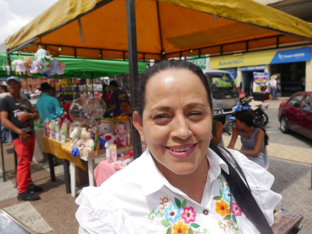 Claudia Patricia Betancurt y su esposo, Jhon Edwin Castaño, encontraron en esta temporada un salvavidas económico. Desde hace dos años participan en la feria. Claudia tiene un emprendimiento de manualidades que lleva seis años en la vereda La Floresta. Cada vez que se anuncia la feria empacan cuidadosamente sus productos y viajan cerca de 30 minutos hasta el casco urbano.