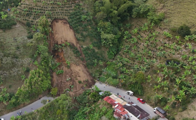 Vista aérea de La Rioja, momentos después del derrumbe que bloqueó la vía Manzanares-Pensilvania (Caldas).