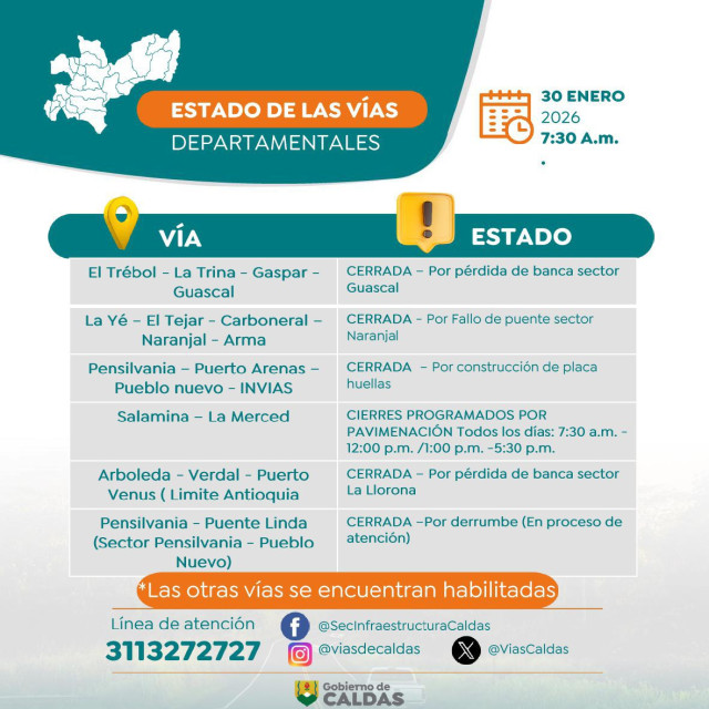 Este es el estado de las vías de Caldas este viernes (30 de enero)
