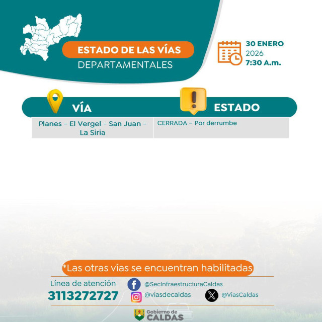 La Gobernación de Caldas entrega el reporte de las vías de Caldas este viernes. Transite con precaución, sobre todo si piensa viajar este fin de semana