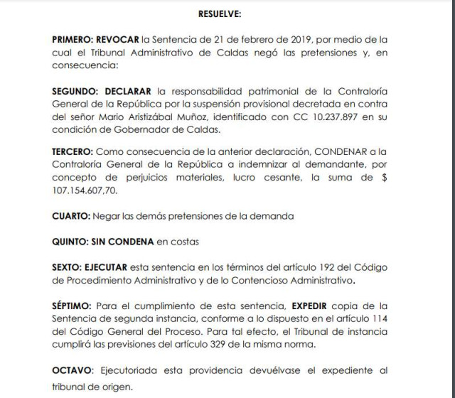 Presentó apelación ante el Consejo de Estado, que falló a su favor la semana pasada. En el comunicado, Aristizábal Muñoz afirmó: “Como ciudadano de bien y orgulloso hijo del departamento de Caldas, siento un gran alivio con esta decisión del Consejo de Estado y si bien el sufrimiento personal y familiar fue inmenso, lo mismo que los daños profesionales y políticos, casi que irreversibles, finalmente la justicia prevaleció”.
