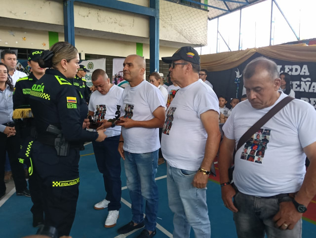 La comandante de la Policía de Caldas, Liliana Andrea Jiménez, condecoró a los policías sobrevivientes de la toma que asistieron a la conmemoración en Arboleda.