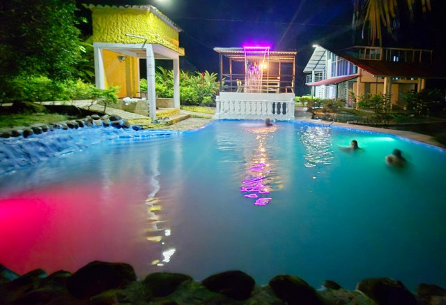 El lugar cuenta con piscinas de agua natural, una cascada de día y otra de luces en la noche, cocina