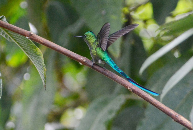 El cometa verdiazul (Aglaiocercus kingii) es una de las 17 especies de colibríes que se pueden observar en el predio El Cedral de Chec.