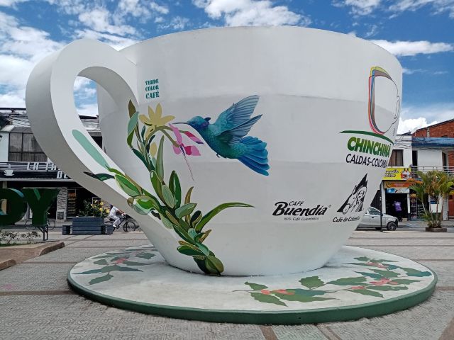 La taza de café gigante ubicada en el Parque de Bolívar, reconocida por ser la más grande del mundo, fue retocada por el colectivo para el disfrute de los chinchinenses.