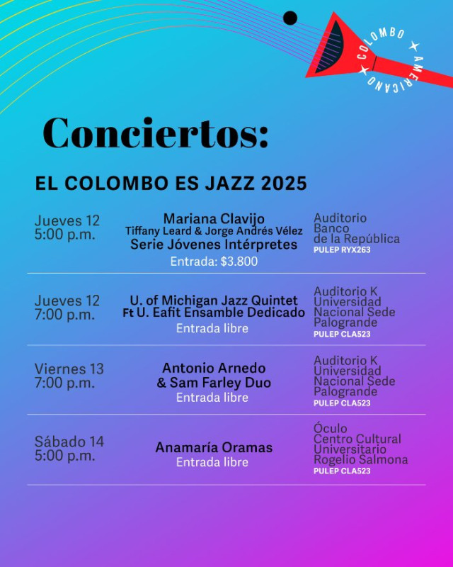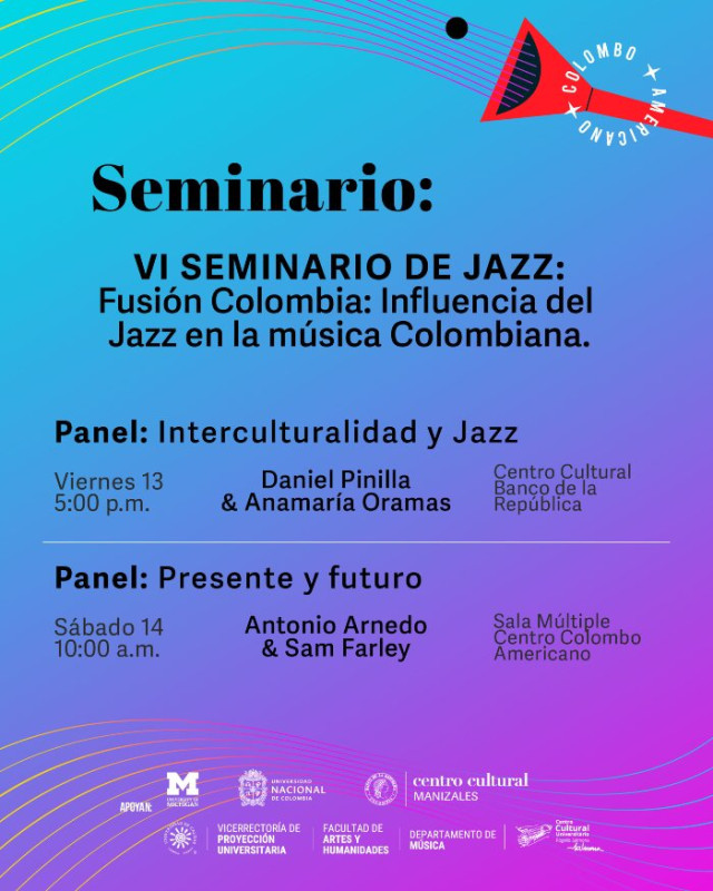 Con el propósito de seguir acercando a la ciudad al universo del jazz, el festival organizado por el Centro Colombo Americano de Manizales trae artistas internacionales y nacionales con entrada gratuita, clases magistrales, talleres especializados y el VI Seminario de Jazz Fusión Colombia: Influencia del jazz en la música colombiana.