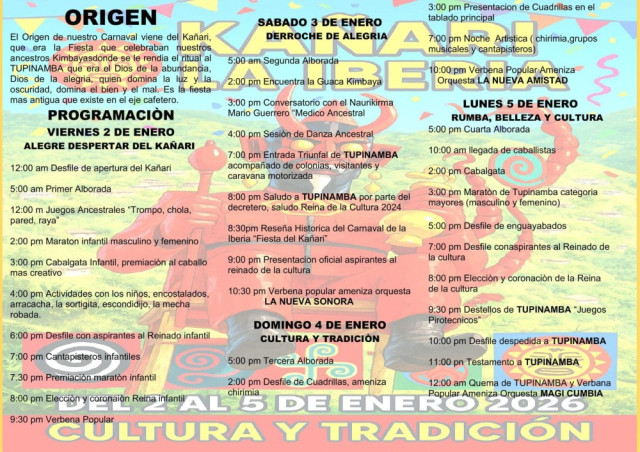 Desfiles, alboradas, juegos ancestrales, cuadrillas, reinado de la cultura, artistas, cabalgata de niños y de adultos, danzas, entrada triunfal de Tupinambá, juegos pirotécnicos y verbena popular, entre otros, hacen parte de la programación.
