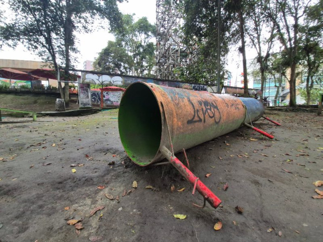 En el parque hay tuberías eléctricas expuestas, con riesgo de electrocución, y tubos, tornillos y varillas sobresalientes, que pueden causar accidentes. Cimientos y soportes de los juegos deteriorados y descubiertos, lo que, según el denunciante, compromete su estabilidad.