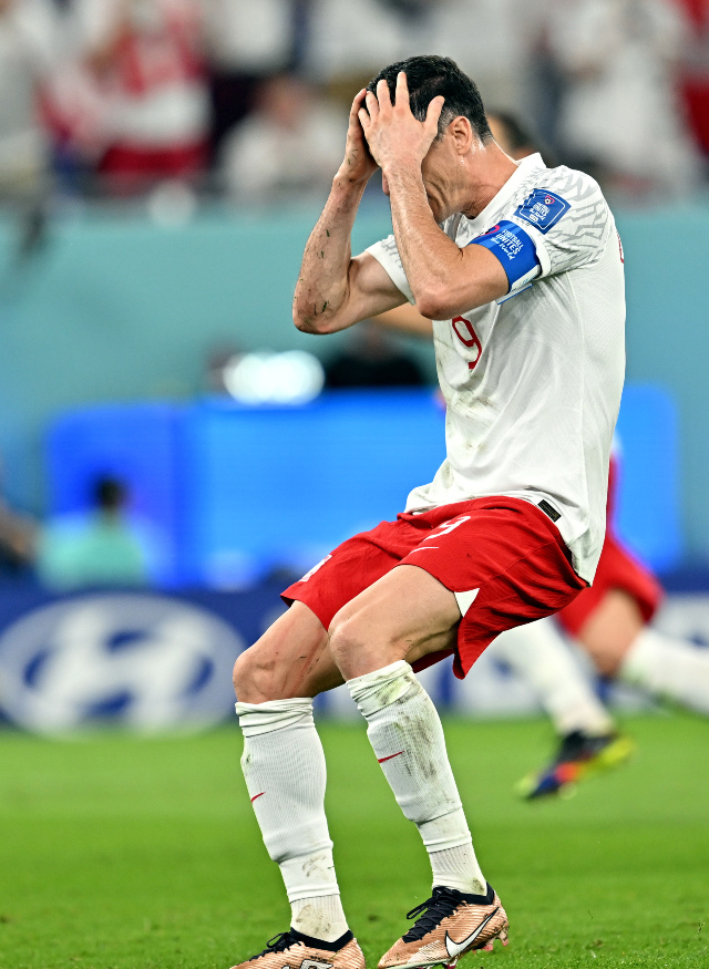 La reacción del jugador de Polonia, Robert Lewandowski cuando el portero mexicano Guillermo Ochoa le atajó el cobro desde el punto penal que pudo significar la victoria polaca.