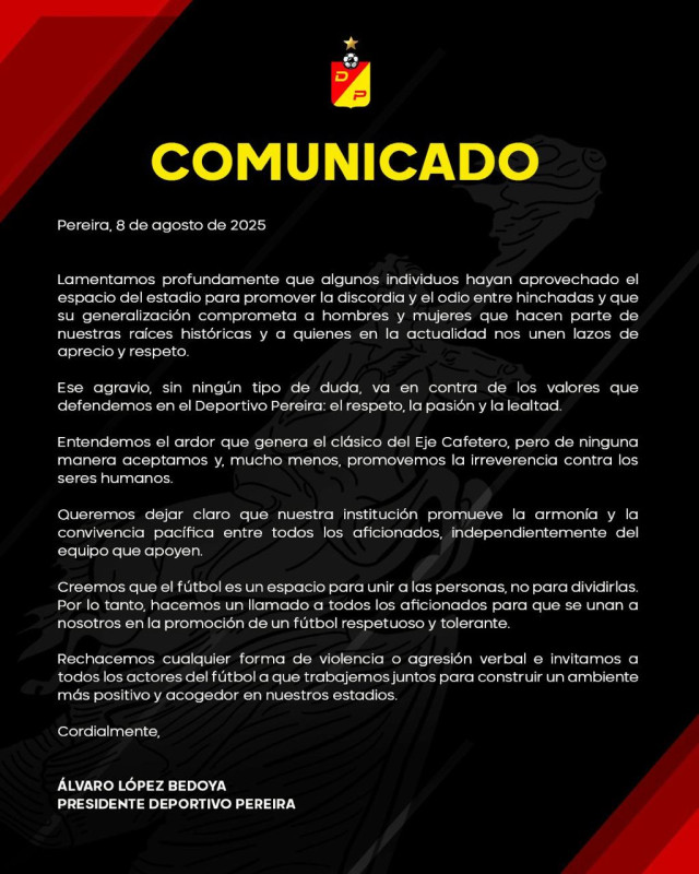 Ese agravio, sin ningún tipo de duda, va en contra de los valores que defendemos en el Deportivo Pereira: el respeto, la pasión y la lealtad.