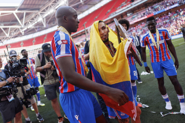 Fotos | EFE | LA PATRIA Jefferson Lerma (i), Jean-Philippe Mateta y Daniel Muñoz (d) de Crystal Palace celebran la victoria del trofeo FA Community Shield luego de una tanda de penaltis contra el Liverpool en el estadio de Wembley en Londres, Gran Bretaña, este domingo 10 de agosto del 2025.