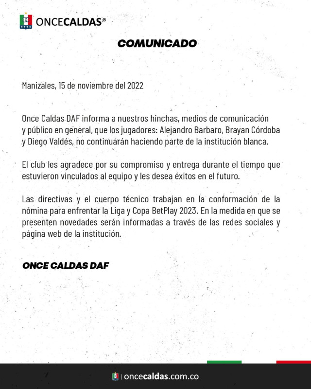 Once Caldas publicó un comunicado en la tarde de este martes en el que anunció la salida de los tres primeros jugadores, luego de no clasificar a los cuadrangulares de la Liga BetPlay.