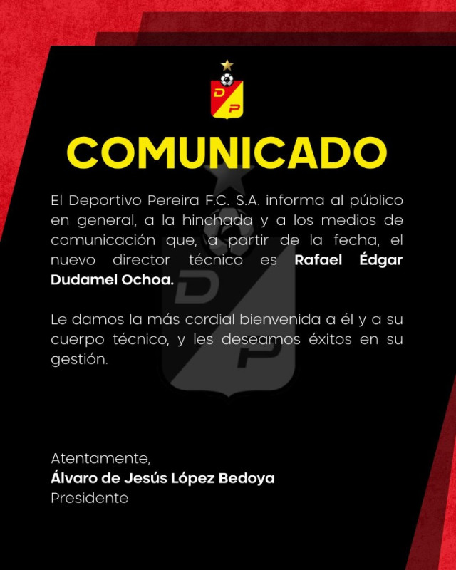 “A partir de la fecha, el nuevo director técnico es Rafael Edgar Dudamel Ochoa. Le damos la más cordial bienvenida a él y a su cuerpo técnico y les deseamos éxitos en su gestión”, señalaron desde el club.