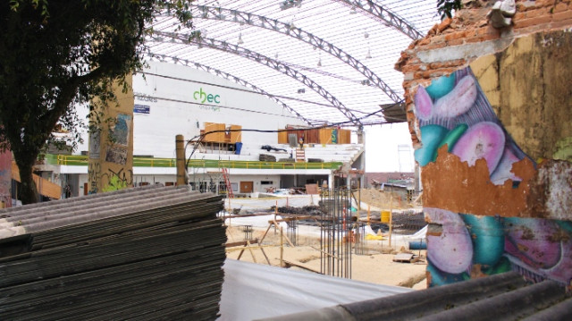 Dos contrastes de los Juegos Nacionales en Manizales: al fondo, el Coliseo Menor, muy adelantado para las justas, y en primer plano, el Mayor, descartado por las demoras.