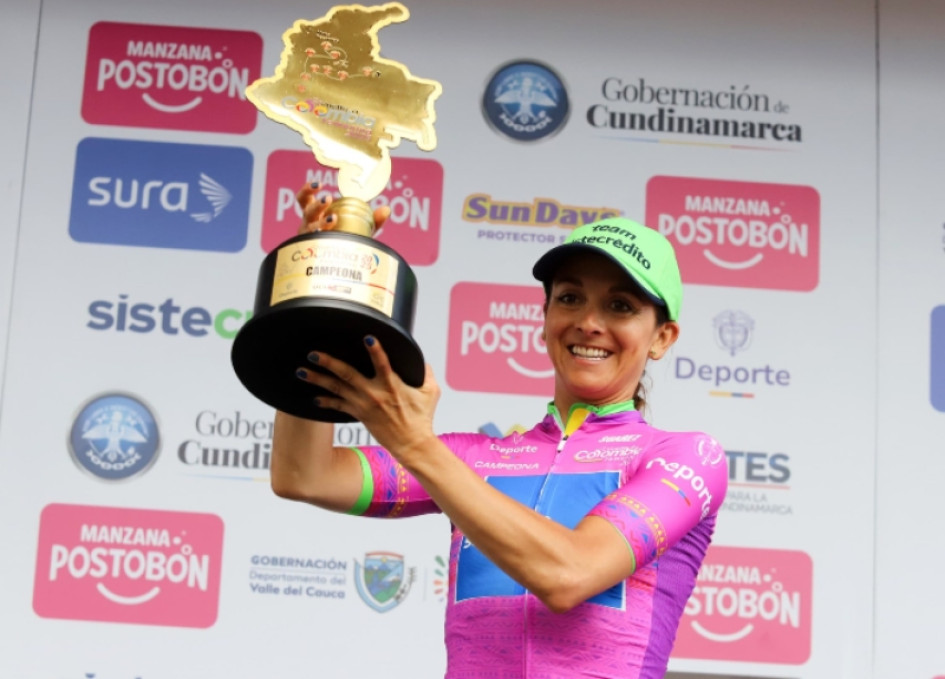 La ciclista manizaleña Diana Carolina Peñueña, hoy con el Team Sistecredito, levanta el trofeo que la acredita como la campeona de la Vuelta a Colombia. Ganó cuatro de las seis etapas y llegó a 10 en la historia de la carrera, récord.