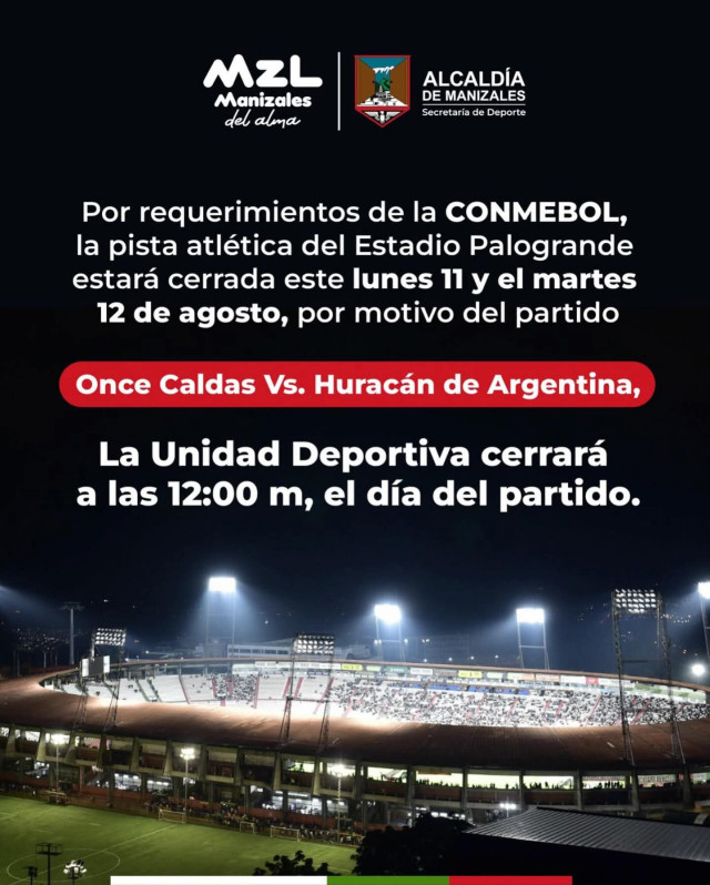 La Secretaría del Deporte de Manizales informó este domingo (10 de agosto) que "por requerimientos de la Conmebol, la pista atlética del estadio Palogrande estará cerrada este lunes 11 y el martes 12 de agosto, por motivo del partido Once Caldas - Huracán de Argentina".