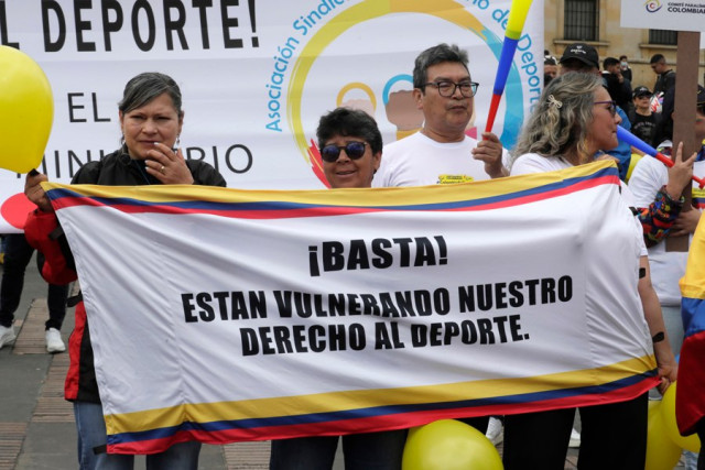 Fotos | EFE | LA PATRIA Personas sostienen una pancarta durante una protesta convocada por el Comité Olímpico Colombiano este lunes, en la Plaza de Bolívar en Bogotá (Colombia).