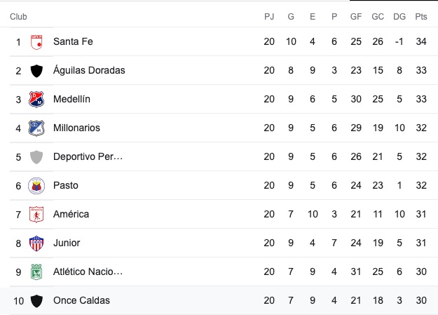 Finalmente los clasificados: Santa Fe, Águilas Doradas, Deportivo Independiente Medellín, Millonarios, Deportivo Pereira, Pasto, América de Cali y Atlético Júnior.