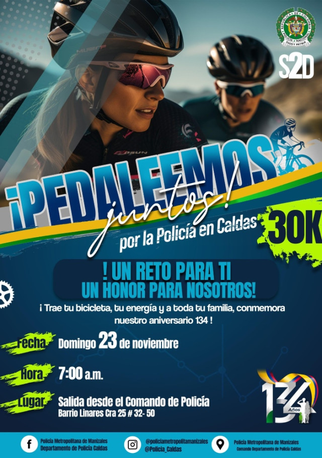 La Policía Metropolitana de Manizales y el Departamento de Policía Caldas anunciaron la realización de “Pedaleemos juntos”, una actividad deportiva que busca integrar a la ciudadanía con motivo de la conmemoración del aniversario 134 de la institución.