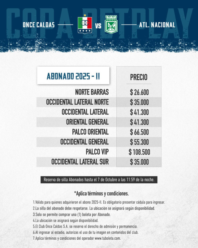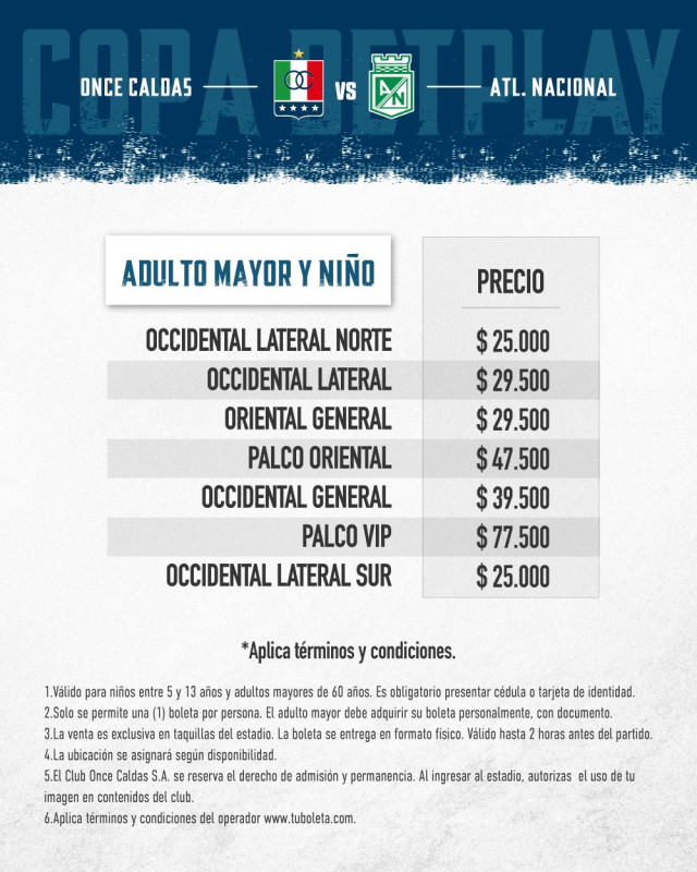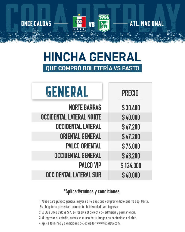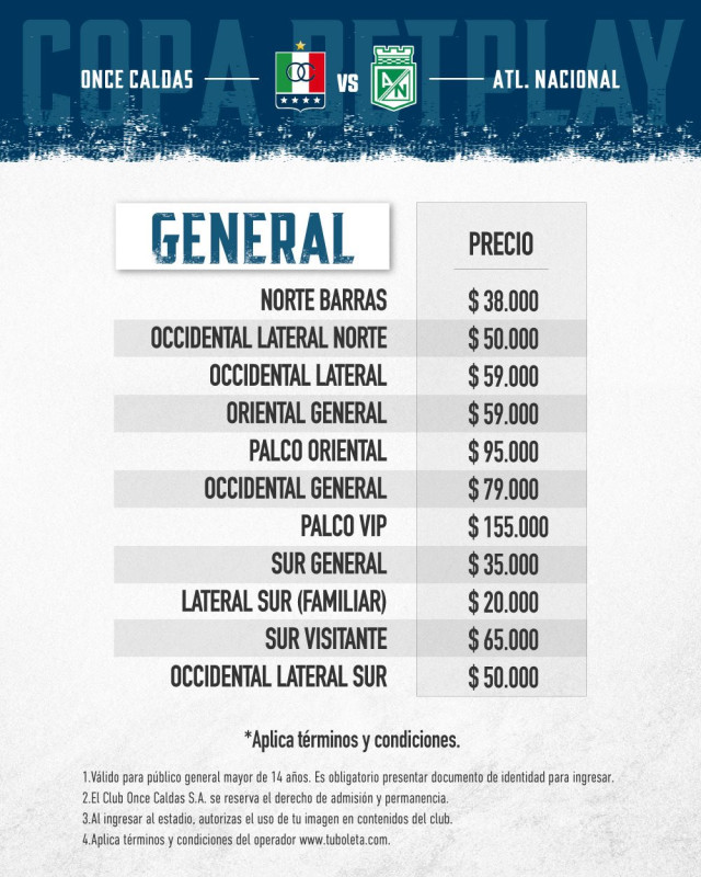 Once Caldas definió para este partido unos precios generales que van desde $38 mil hasta $155 mil. La Comisión Local del Fútbol permitirá el acceso de 2.500 hinchas de Nacional, integrantes de la barra Los Del Sur, y para ellos la boleta costará $65 mil.