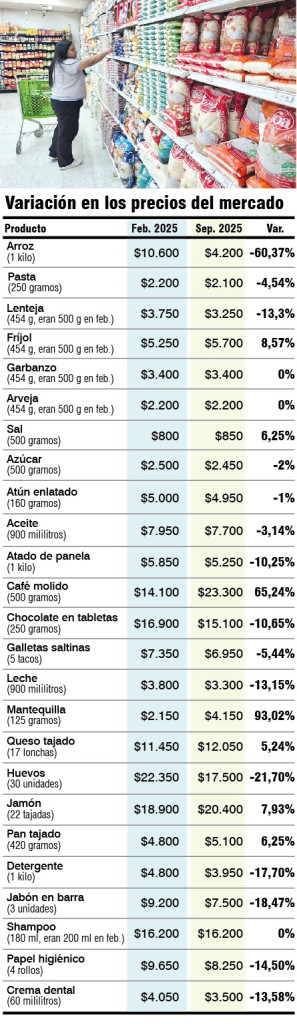 $189 mil 300 fue el costo del mercado de septiembre del 2025 de LA PATRIA (25 productos básicos). Bajó un 3,02% frente a febrero del 2025, cuando la factura se situó en $195 mil 200.