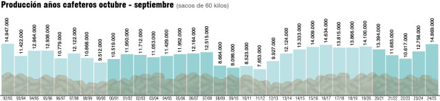 El gerente de la Federacafé sostuvo que aunque no tiene bola de cristal, este año completo del 2025 se podría llegar a una producción de entre 13 millones y 13,5 millones de sacos, cifra que, de todos modos, sigue siendo alta. En el 2024 fue de 13 millones 997 mil sacos de 60 kilos.