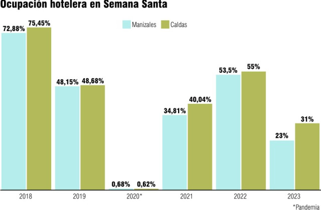 La situación en Manizales fue más desalentadora, los hoteles se llenaron en un 23% esos días, mientras que en el 2022 la ocupación fue del 53,5%, o sea que este año bajó 30,5 puntos (Ver recuadro Ocupación hotelera en Semana Santa).
