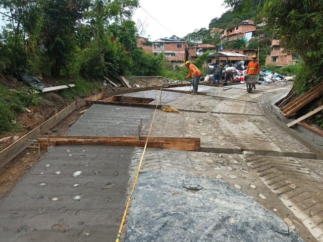 El proyecto vial en el sector San Juan de Marmato registra un avance del 60%. La intervención contempla 601 metros de placa huella, drenajes y muro de contención.