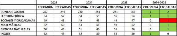 En el 2023 los colegios de los 26 municipios a cargo de la Gobernación de Caldas, es decir diferentes de Manizxales, obtuvieron un puntaje global de 249 en las Pruebas Saber 11. En el 2024 sumaron dos puntos más, por lo cual llegaron a 251. Y en este 2025 acumularon otros dos y subieron a 253.