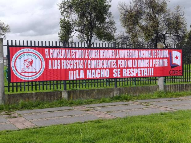 Entre tanto, en la sede de la Unal en Bogotá, se lee una pancarta con el siguiente enunciados: “El Consejo de Estado le quiere devolver la Universidad Nacional de Colombia a los fascistas y comerciantes, pero no lo vamos a permitir ¡¡¡La Nacho se respeta!!!”.