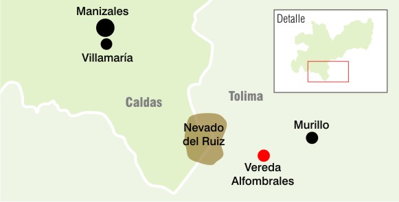A las 6:00 de la mañana, de cada día, doña Maryori Pineda enciende el fogón de leña en la parte baja de Alfombrales, vereda en la zona de emergencia por la alerta naranja con el volcán nevado del Ruiz. "Preparo los tragos de café para todos", comenta la señora. 10 minutos después se levanta su hija Valery Lorena, quien se baña, se arregla y queda lista para caminar la hora de distancia que hay hasta la escuela. A las 6:30 el esposo de la señora, Yamel González, comienza las dos horas de ordeño, actividad que le da el sustento a la familia.