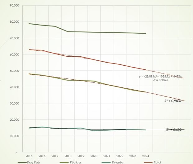 En el sector privado la población estudiantil es más o menos homogénea, uniforme. En el sector público es en el que hemos tenido la mayor reducción: de casi 49 mil estudiantes en el 2015 a 37 mil en el 2024. En esa proyección, si se conserva la tendencia estadística, pues estaríamos en unos 31 mil alumnos en el 20272.