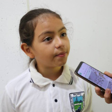 “Me llamo Juliana Cuartas. Tengo ya casi 11 años y estoy en quinto, ssoy en grado quinto. Voy a hablar del gobierno de aula. Nosotros lo elegimos por votaciones. Cuando tenemos candidatas elegimos a nuestro presidente. Las que no tuvieron casi votos, no perdieron, sino que son sus presidentas, secretarias. Votamos en secreto y después contamos los votos para saber quién ganó. Me gusta esta escuela porque siempre nos enseñan jugando, siempre la profe nos enseña algo nuevo y jugamos divertidos juntos”.