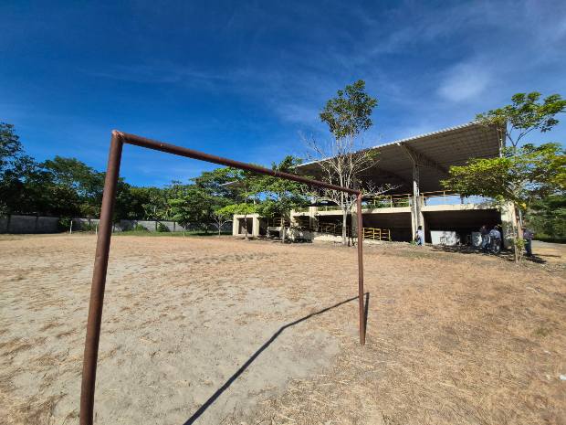 Señala un espacio detrás del Polideportivo. Al llegar al lugar, se encuentra con la realidad de dos arcos, sembrados en un arenal, a cielo abierto. Allí, a pesar de los 40 grados, los estudiantes sacian sus deseos de deporte, recreación, gambetas y goles.
