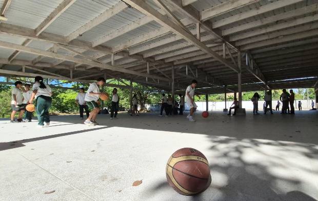 El docente hace un alto en su clase. Los alumnos corren detrás de balones de baloncesto en un corredor con piso en baldosa, en un espacio que forma parte del comedor escolar. “Miren, esto es un peligro, un chico podría sufrir luxaciones, o caerse y lesionarse”.
