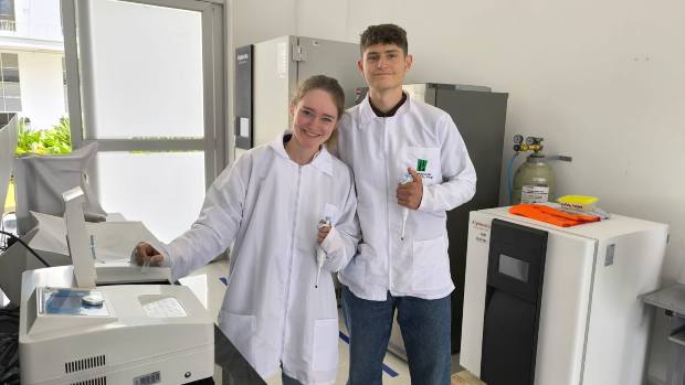 Anna Rau, de la Universidad de Rostock, y Julian Etienne Koop, de la Universidad de Lübeck, ambas en Alemania, en el Laboratorio de Proyectos de Investigación de la Universidad de Manizales.