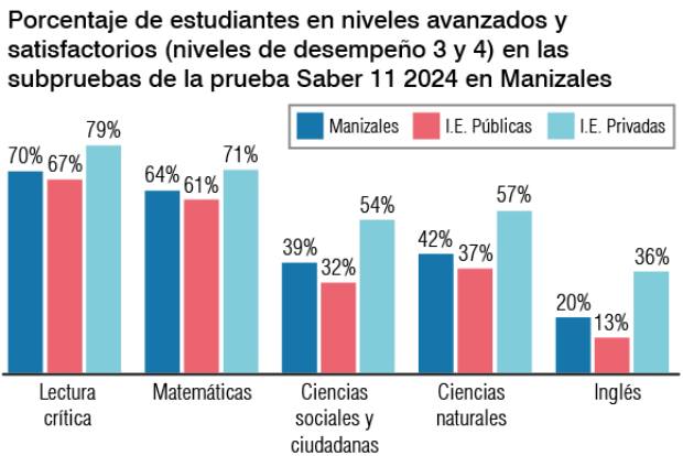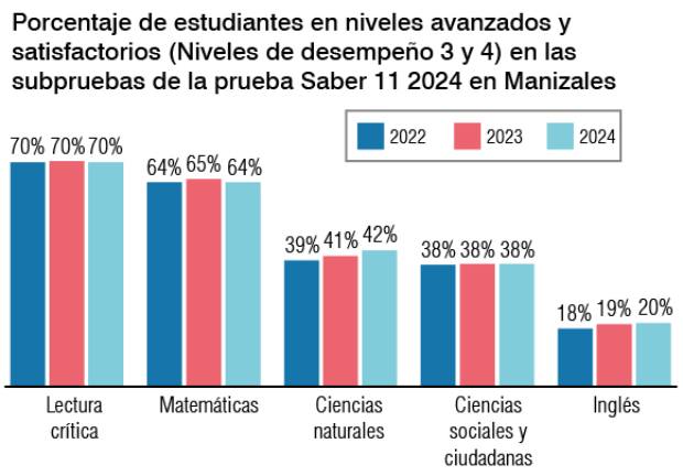 Imágenes I Cortesía Manizales Cómo Vamos I LA PATRIA. “La estabilidad de los resultados entre 2022 y 2024 en las subpruebas de la Saber 11, sin variaciones significativas en lectura crítica, matemáticas, ciencias naturales, ciencias sociales e inglés, debe ser el punto de partida para una reflexión sobre calidad educativa en Manizales”.