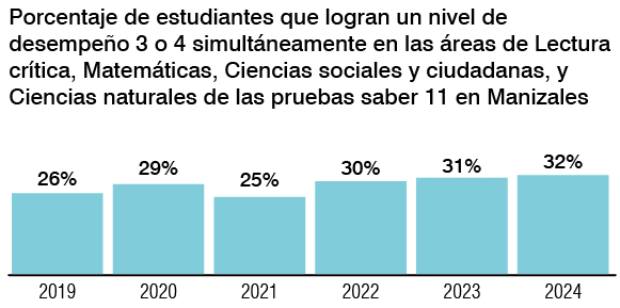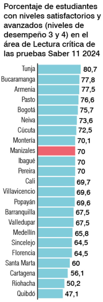 Por su parte Manizales Cómo Vamos que por ejemplo la estabilidad de los resultados entre 2022 y 2024 en las subpruebas, sin variaciones significativas en lectura crítica, matemáticas, ciencias naturales, ciencias sociales e inglés, debe ser el punto de partida para una reflexión profunda sobre la calidad educativa en la ciudad.