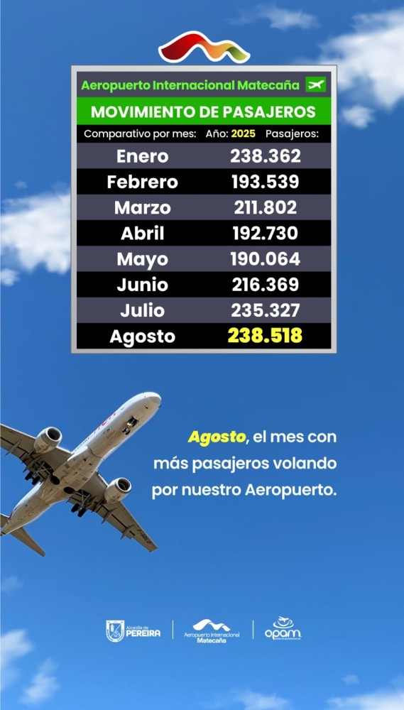 En agosto de 2025 la cifra de movimiento de pasajeros por el Aeropuerto Internacional Matecaña alcanzó un total de 238.518 pasajeros