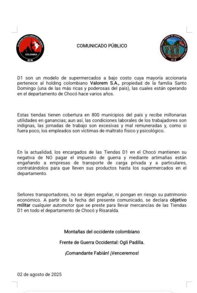 “Señores transportadores, no se dejen engañar ni pongan en riesgo su patrimonio económico. Desde la fecha, cualquier automotor que se preste para llevar mercancías de D1 en Chocó y Risaralda será considerado objetivo militar”, indica el mensaje.