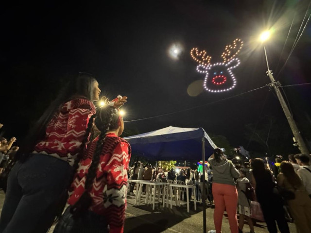 El evento transformó el cielo de Dosquebradas en un lienzo nocturno. 120 drones se elevaron para formar figuras luminosas que evocaban la identidad local: el nombre del municipio, su Primera Casa, elementos navideños y símbolos asociados a la transformación urbana.