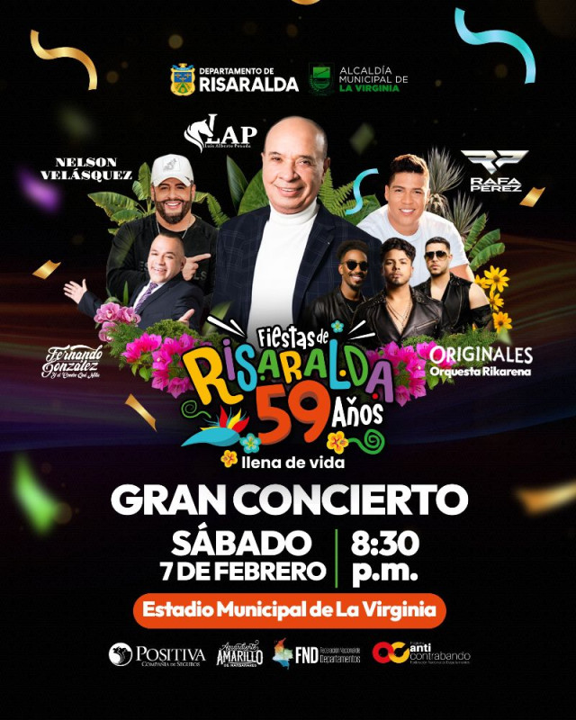 “Este gran concierto hace parte de la celebración de los 59 años de Risaralda y refleja el propósito de llevar las fiestas a los municipios, acercando la cultura y el entretenimiento a la gente. La Virginia será el escenario de un evento pensado para el disfrute de todos los risaraldenses, con artistas de amplio reconocimiento nacional e internacional”.