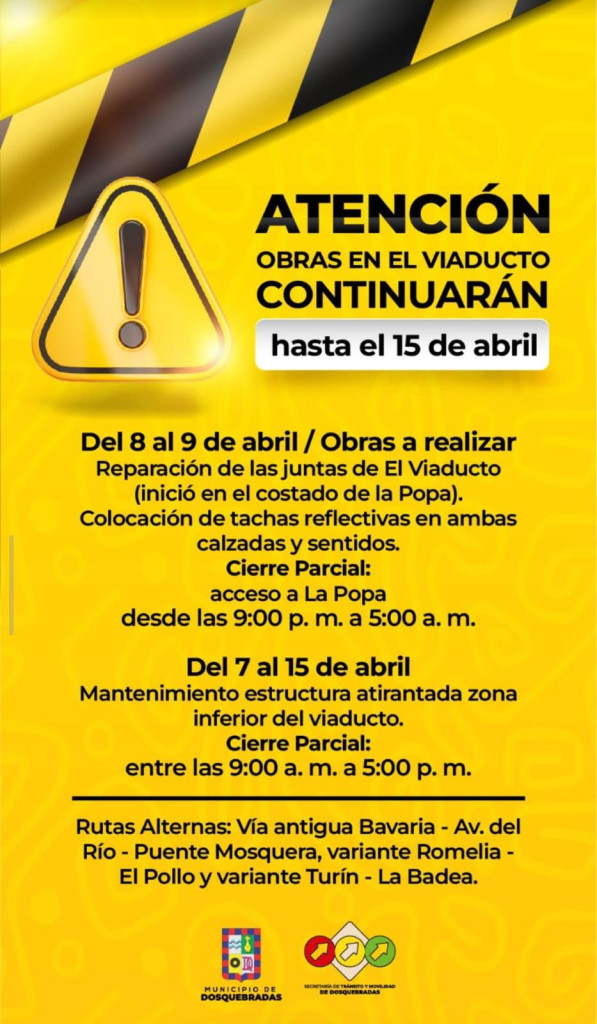 La Alcaldía de Dosquebradas y la Secretaría de Tránsito y Movilidad informaron que las obras en el Viaducto que une a Pereira y el municipio industrial, continuarán hasta el próximo 15 de abril.