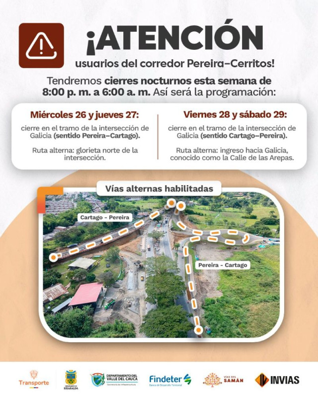 La vía ente Pereira y Cartago, a la altura de Galicia, tendrá cierres totales nocturnos entre las 8:00 p. m. y 6:00 a. m., del 26 al 29 de noviembre.