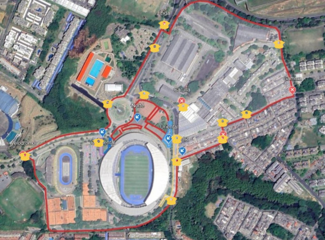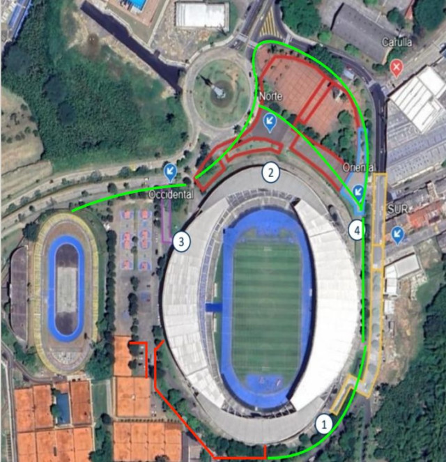 De acuerdo con la información técnica del operativo los cierres perimetrales alrededor del estadio iniciarán desde la medianoche, especialmente en sectores cercanos al velódromo y la zona residencial.