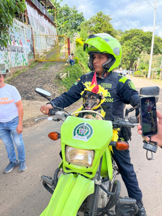 Uno de los momentos más divertidos fue la participación de “Care Mico”, un perro que, disfrazado de gallina, desfiló en motocicleta junto a un uniformado en la estación de Policía, llenando de alegría a grandes y pequeños.
