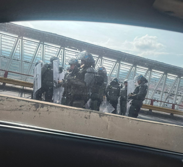 Agentes policiales hicieron presencia en el Viaducto, durante la protesta de hinchas del Deportivo Pereira.