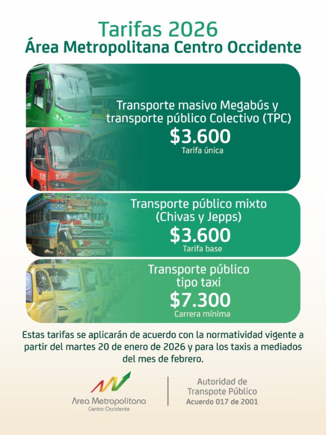 En 2026 cada pasaje costará $3.600, tras un aumento del 10,77% frente a la tarifa vigente de $3.250. Los precios aplican para Pereira, Dosquebradas y La Virginia